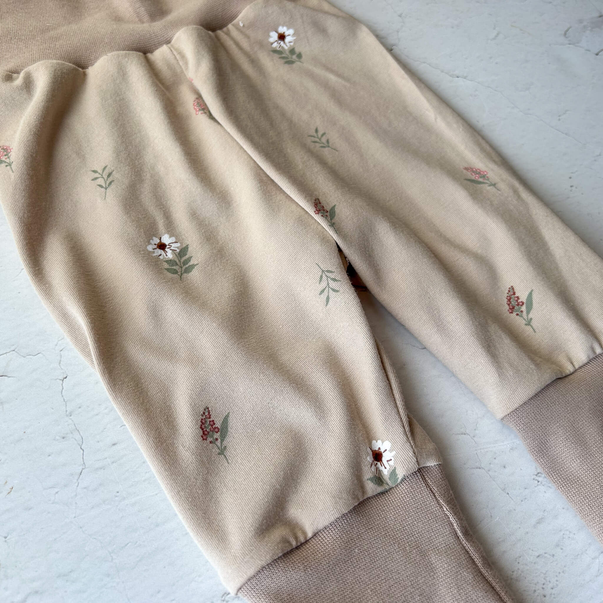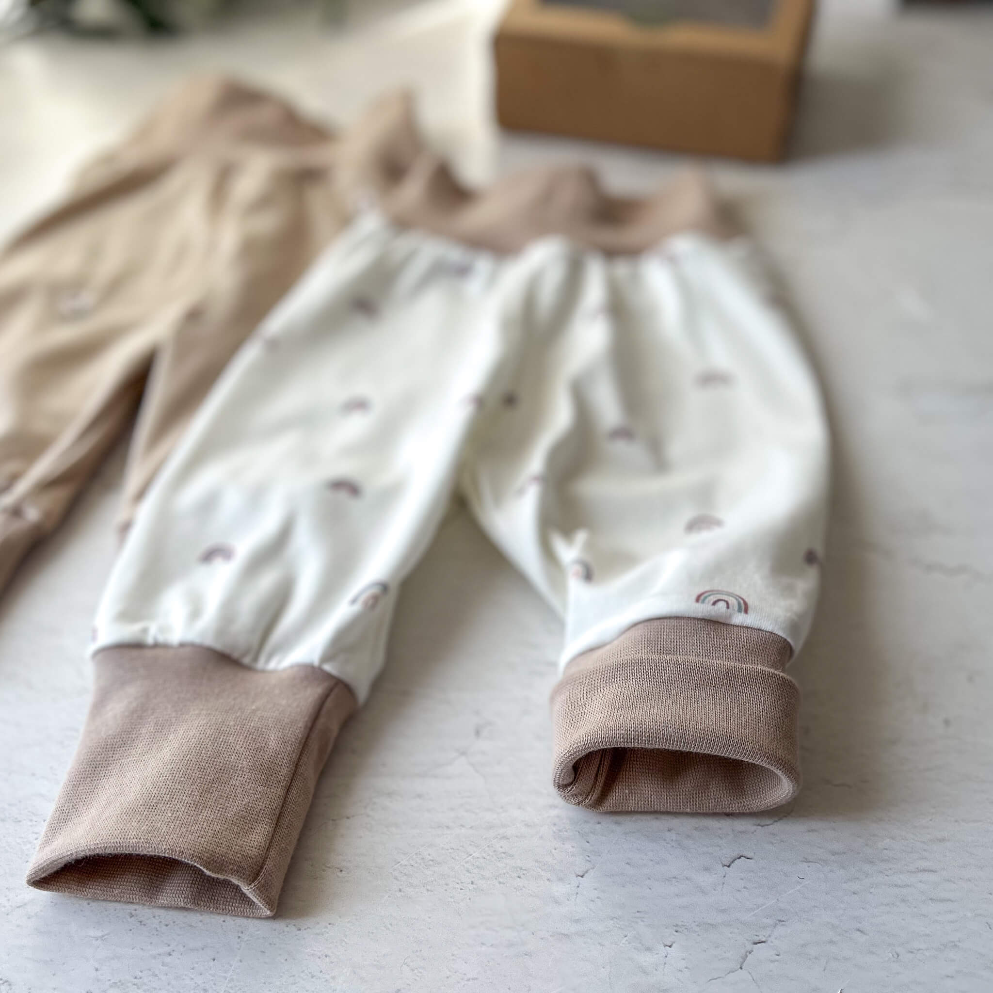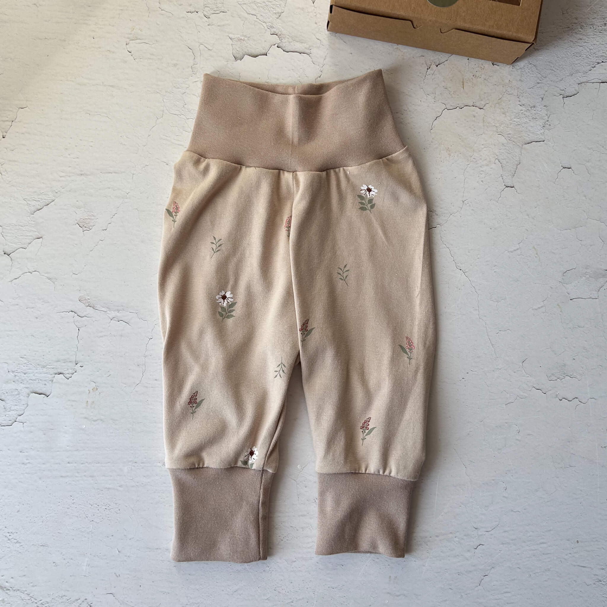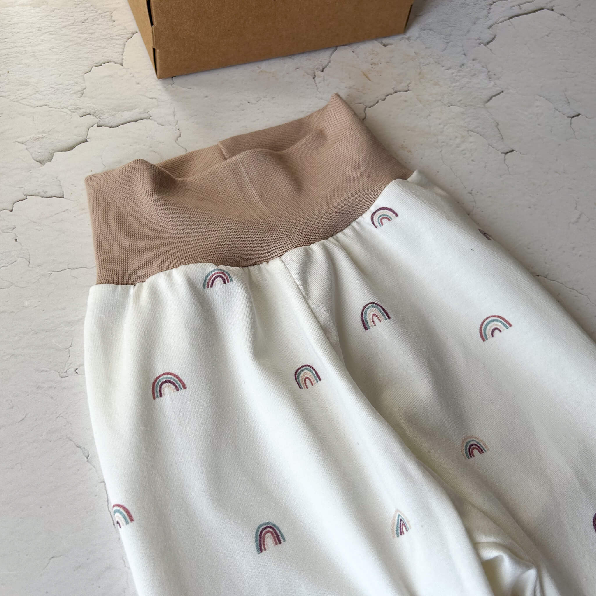 Die liebevoll gestalteten Pumphosen mit Regenbogen- und Blumen-Motiv sind in ruhigen, natürlichen Farben gehalten und passen zu jedem Outfit. Das weiche, elastische beige Bündchen sorgt für einen bequemen Sitz ohne Einengen und wächst flexibel von Größe 62 bis 68 mit. So hat das Baby genügend Bewegungsfreiheit zum Strampeln, Krabbeln und Entdecken.